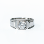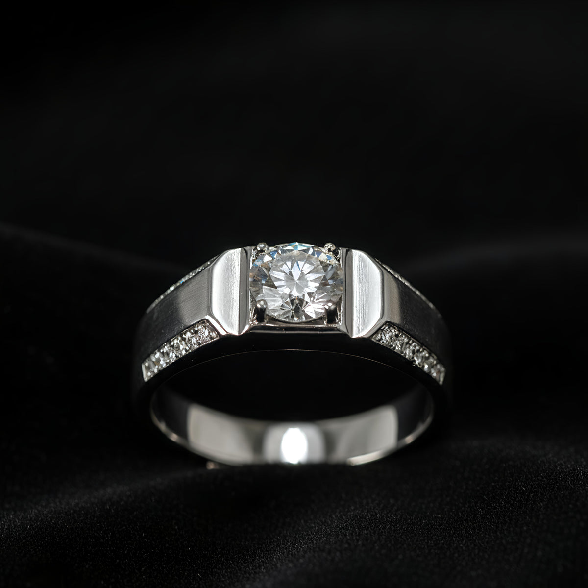 Eterna Valor Ring, a masterpiece of masculine elegance. Crafted in 925 sterling silver, this bold design showcases a 1.00 ct round-cut moissanite, renowned for its diamond-like brilliance and fire. The wide, polished band is enhanced with subtle moissanite side stones, adding a refined sparkle while keeping its strong, powerful look.